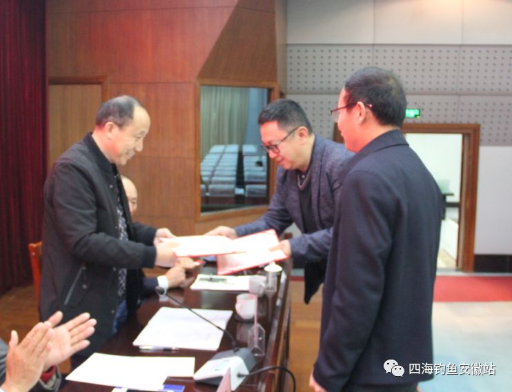 会上安徽省休闲垂钓协会聘请了任海深、庄立权、刘国友、姚华明、张振才5位领导作为协会高级咨询员,并由周磊会长为高级咨询员颁发聘书。